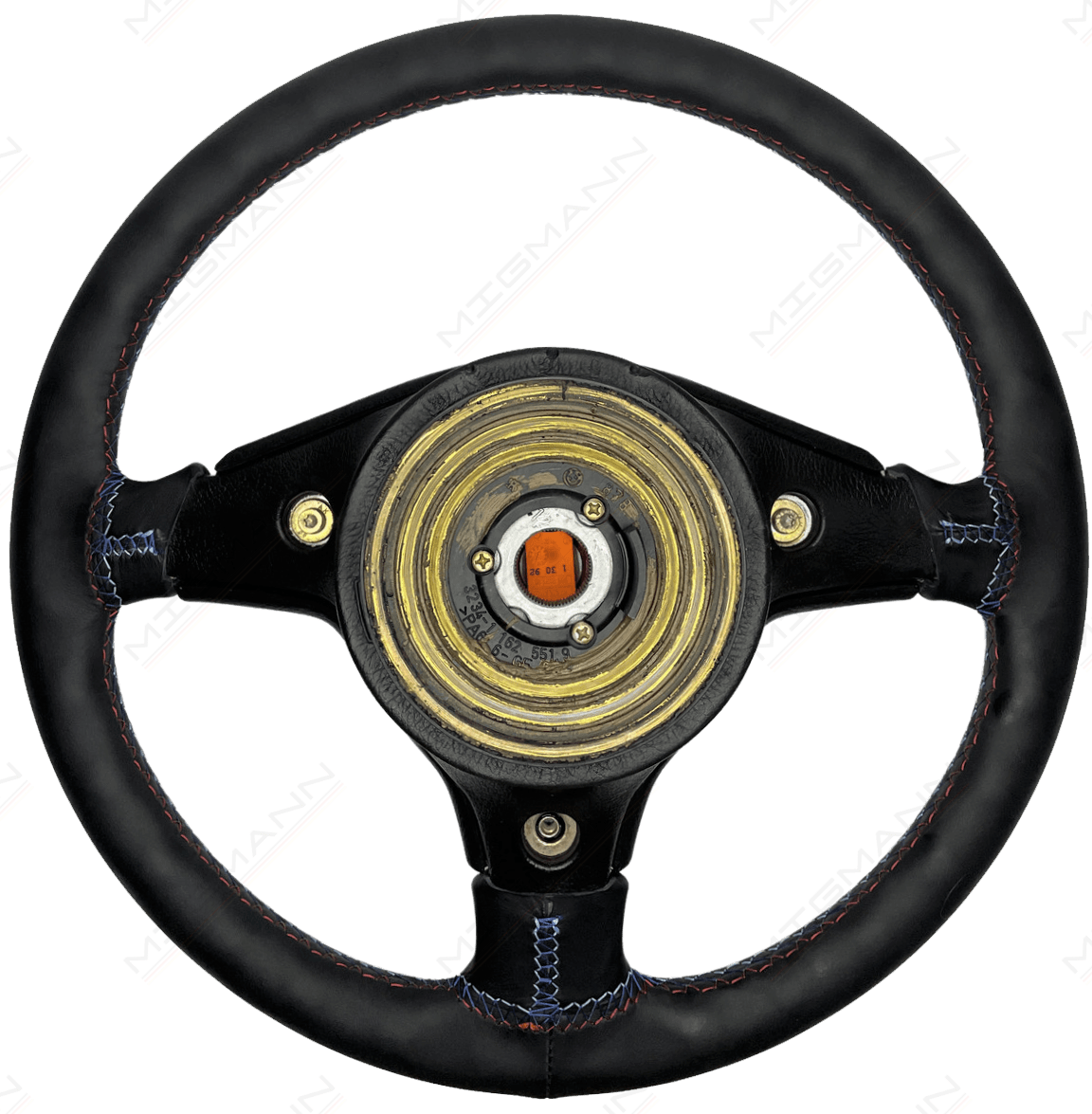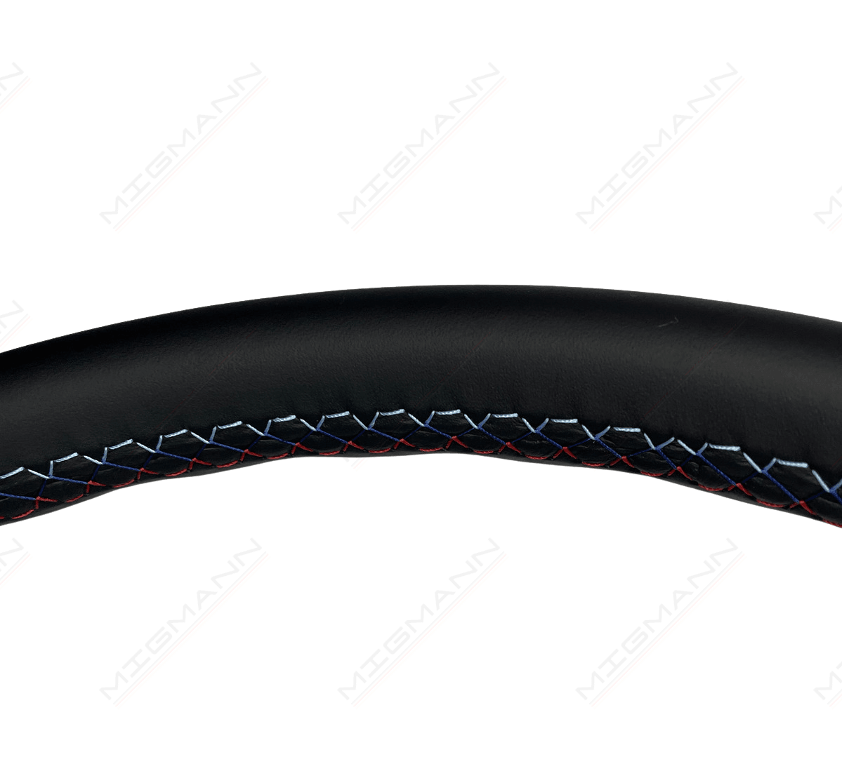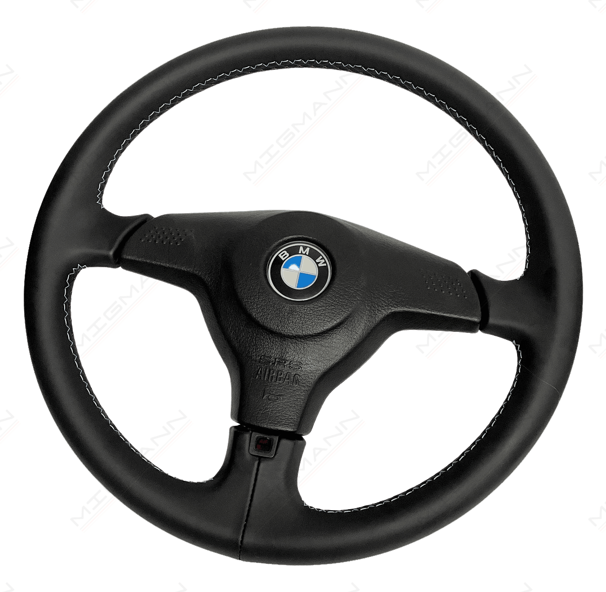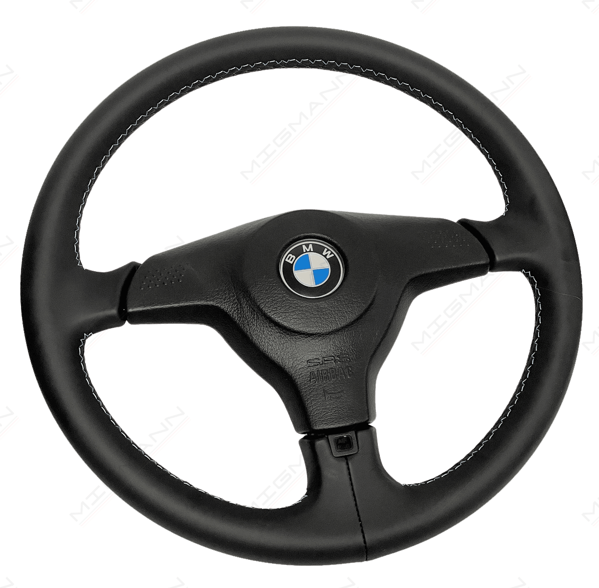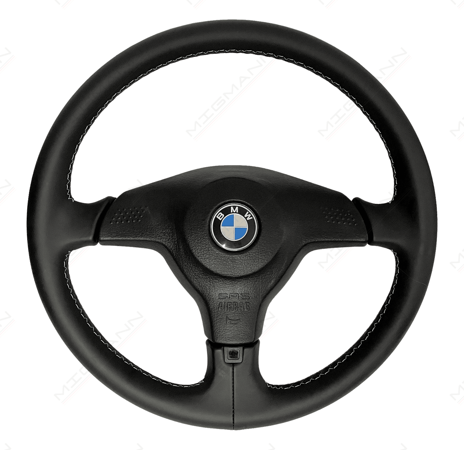 BMW steering wheel in perfect condition with newly refurbished leather with M color stitching.