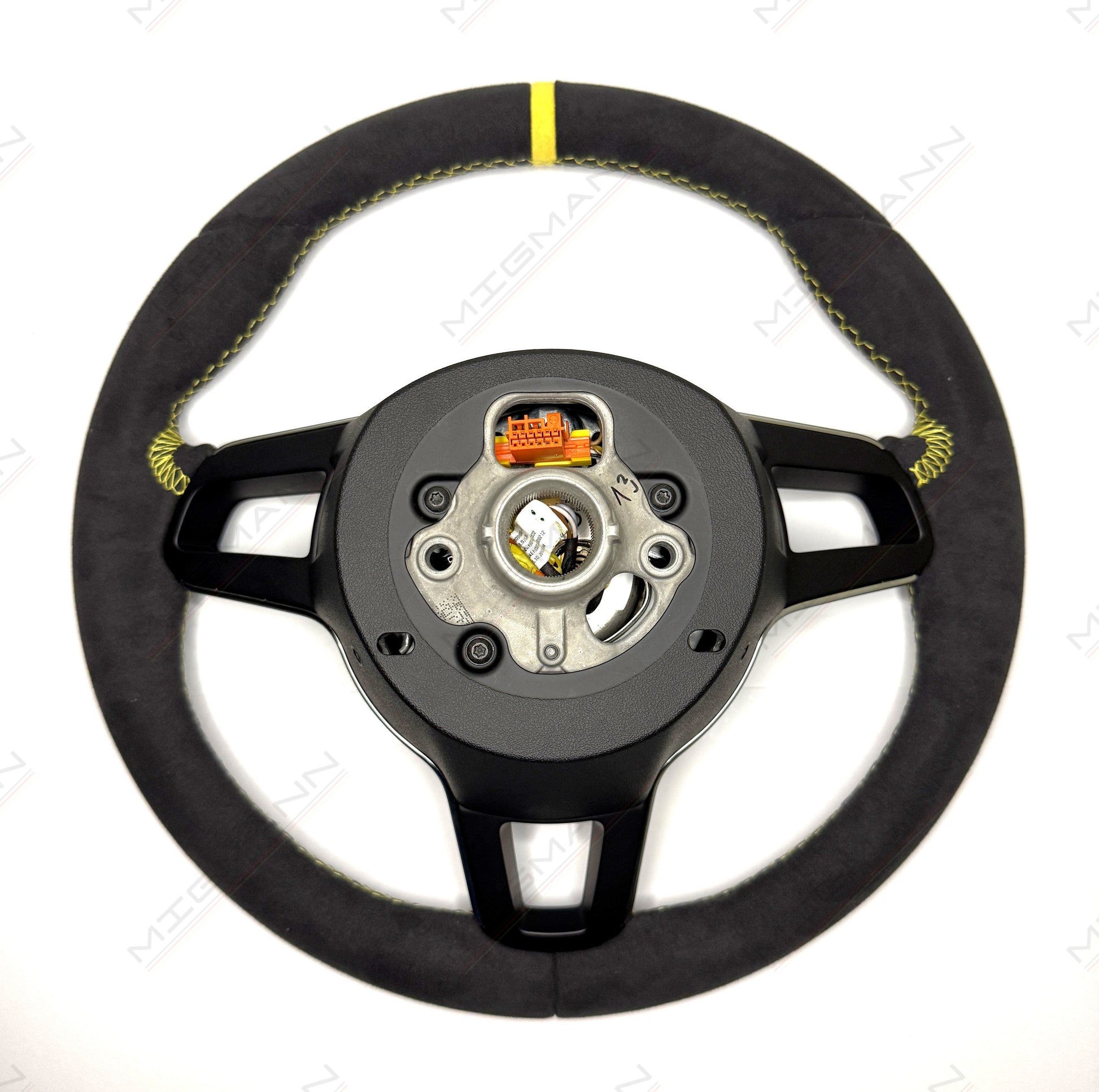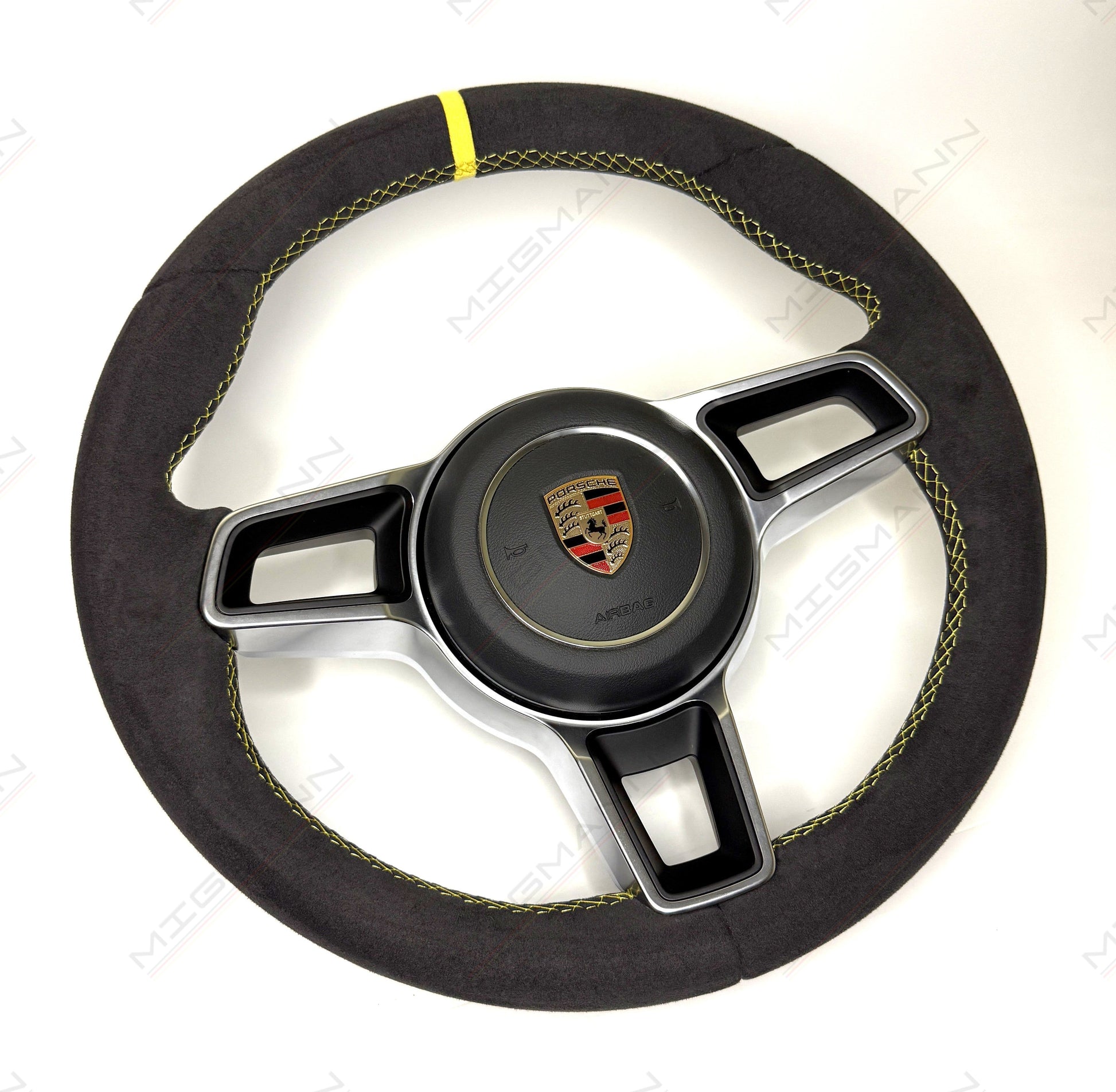 Porsche 911 steering wheel is designed for manual Porsche models without multifunction buttons. Finished in premium grey Alcantara with yellow stitching and a yellow top marker, it provides a motorsport-inspired design that enhances interior aesthetics while maintaining OEM fitment and quality.