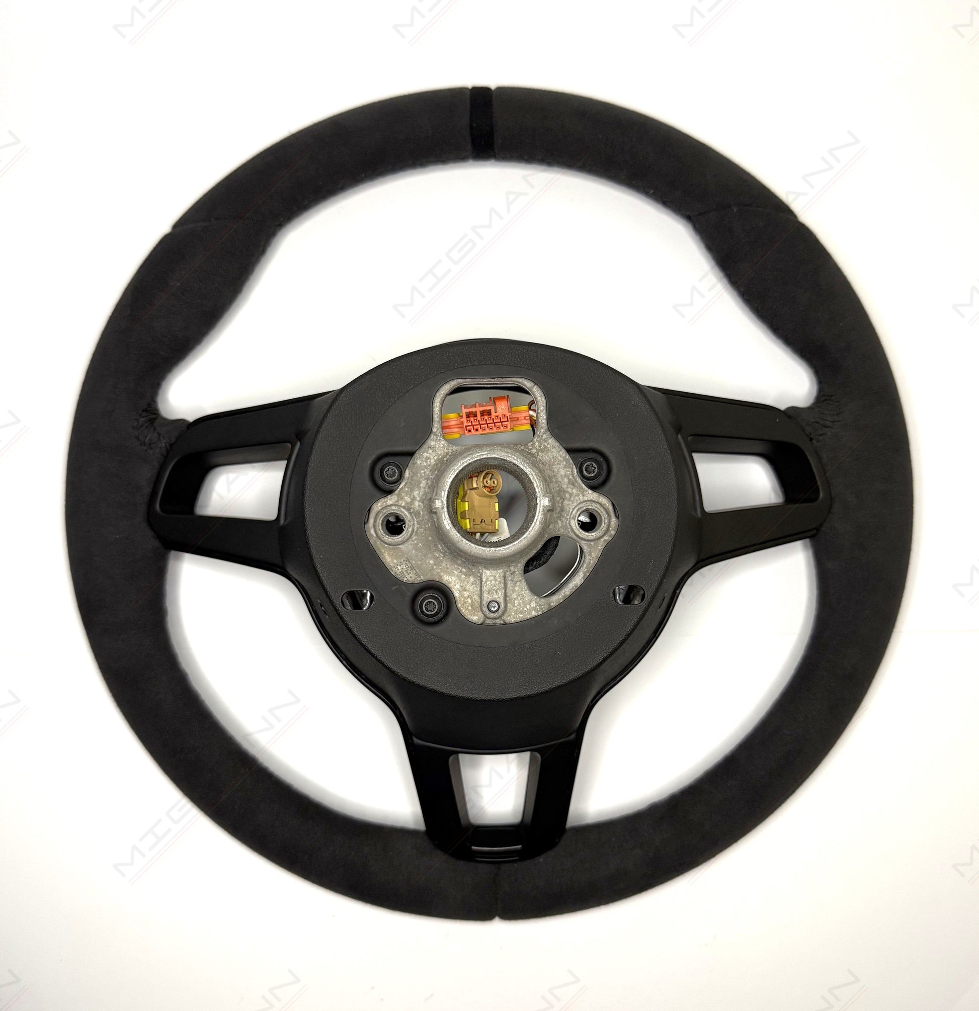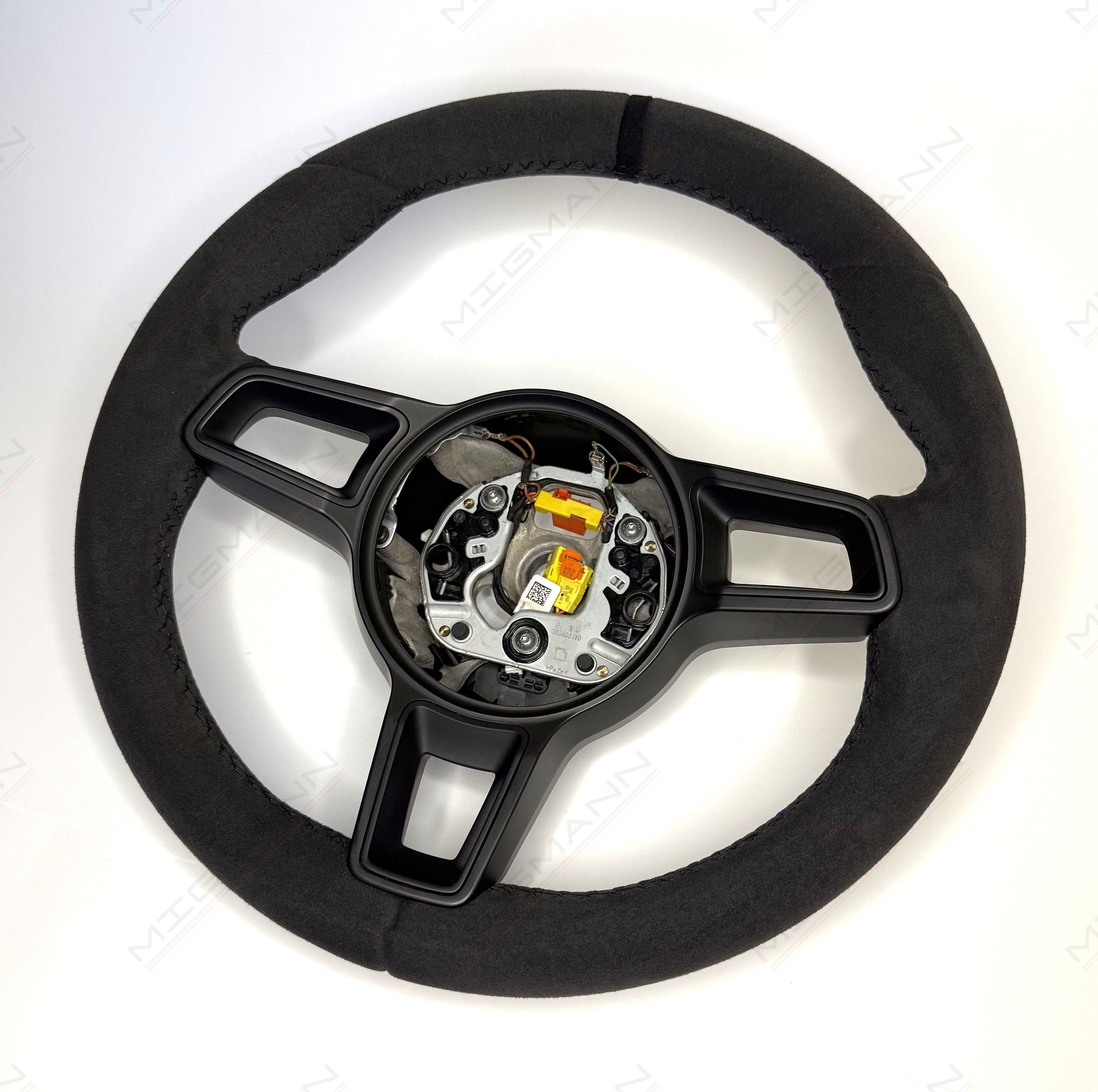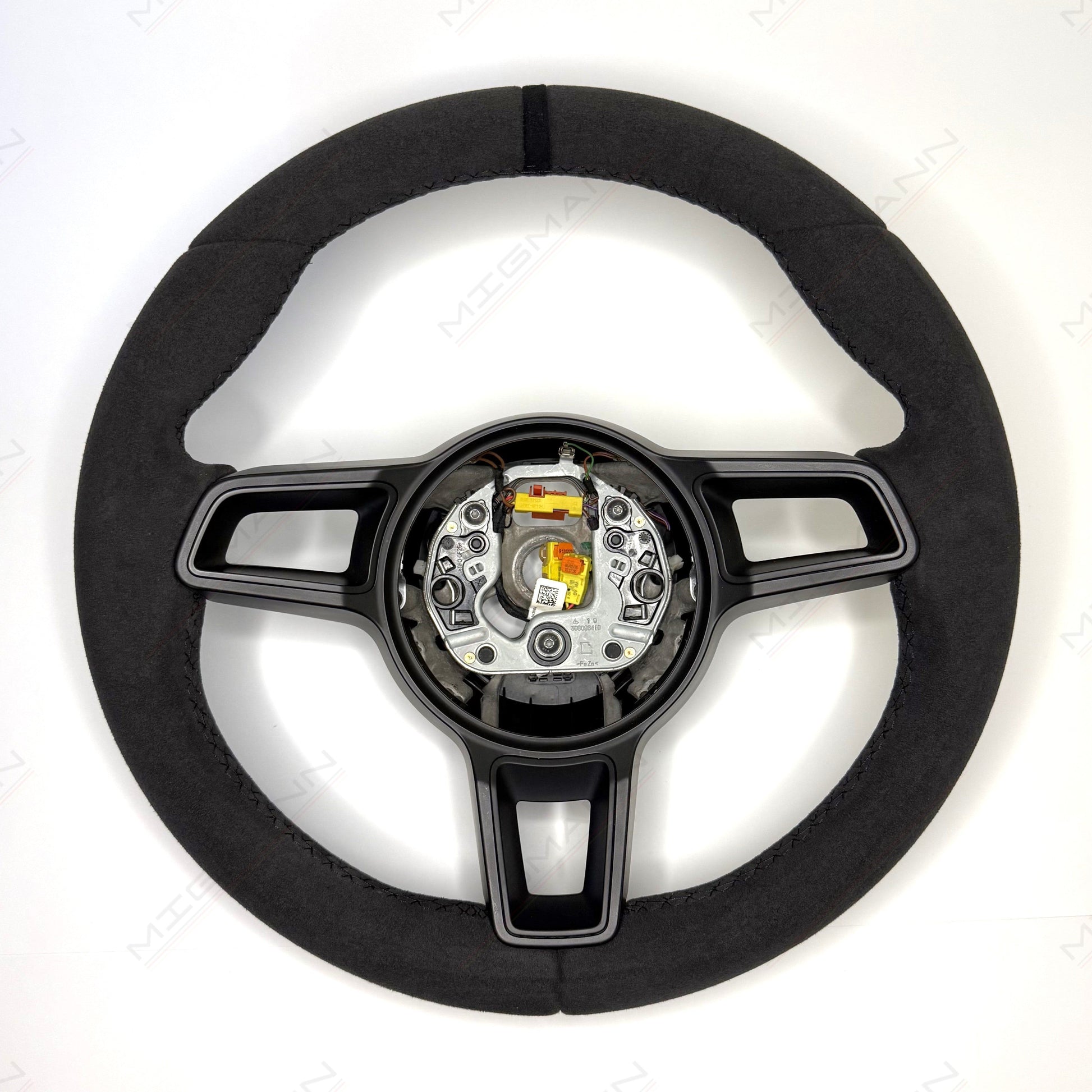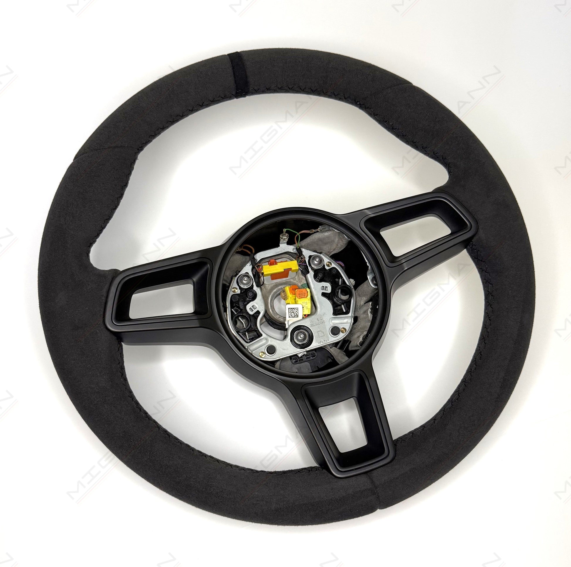 Porsche Alcantara steering wheel with black marker and black stitching, without paddle shifters for manual Porsche cars in excellent condition.