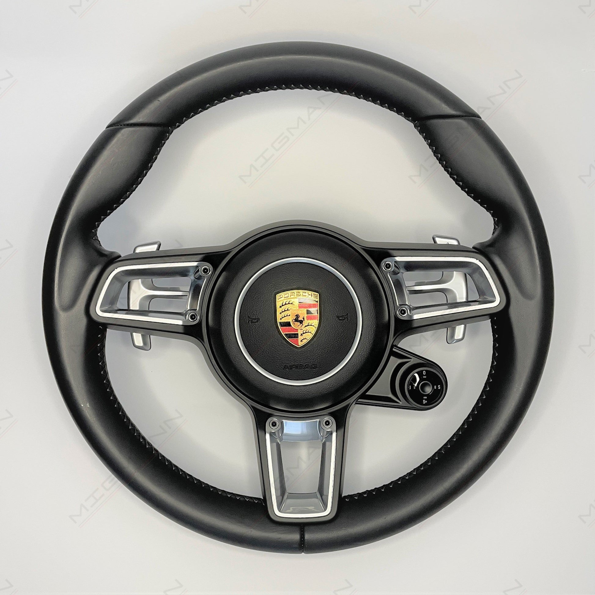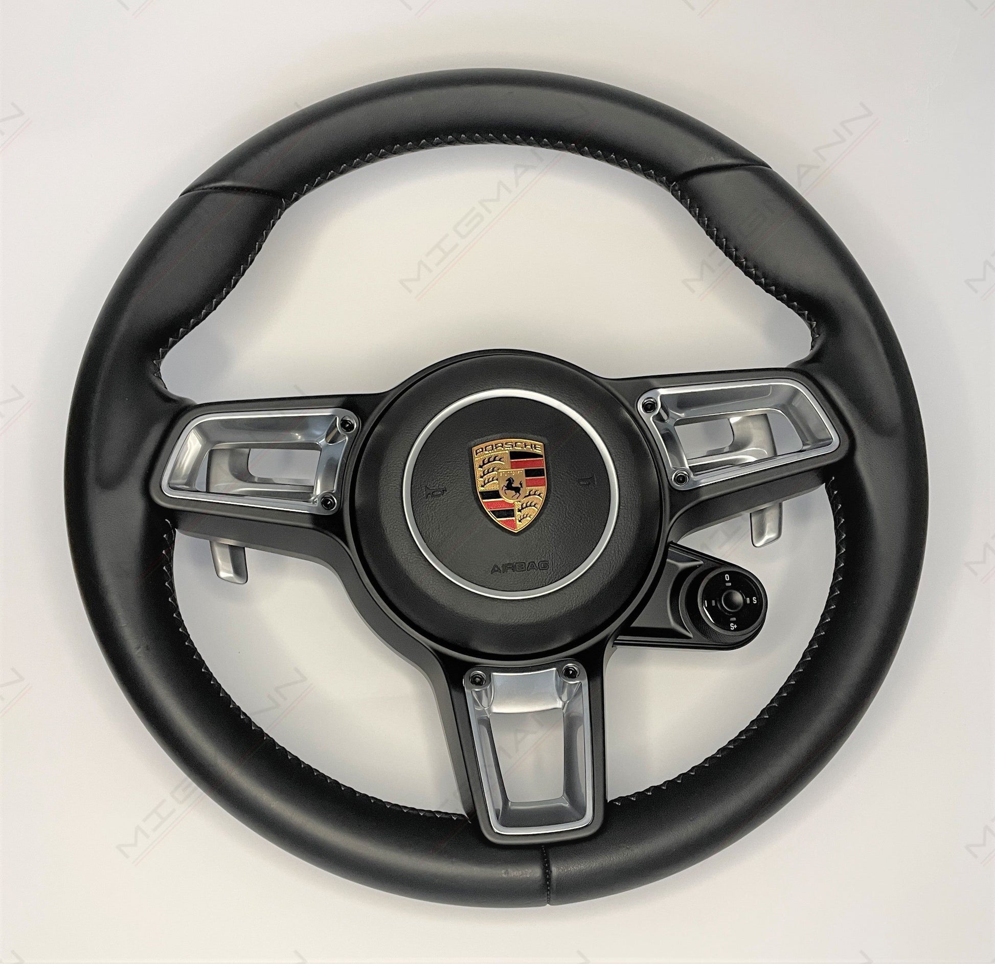 The Porsche GT style steering wheel comes equipped with the Chrono controller, in good condition.