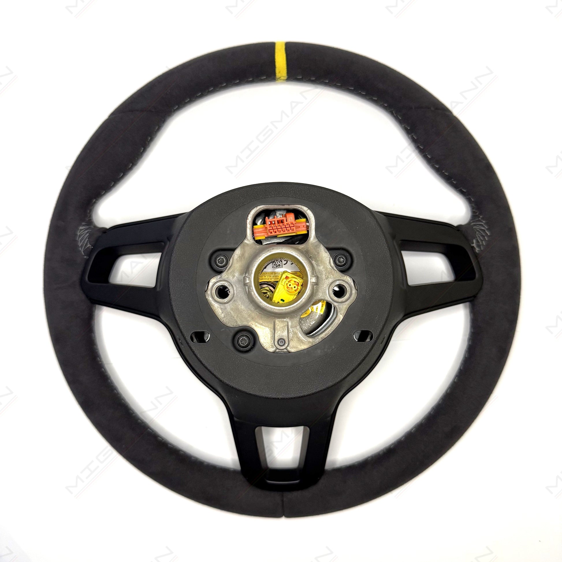 Exceptionally rare Porsche GT3 alcantara style steering wheel with yellow marker, specifically designed for manual Porsches without Multifunctional buttons. This steering wheel is in very good condition.