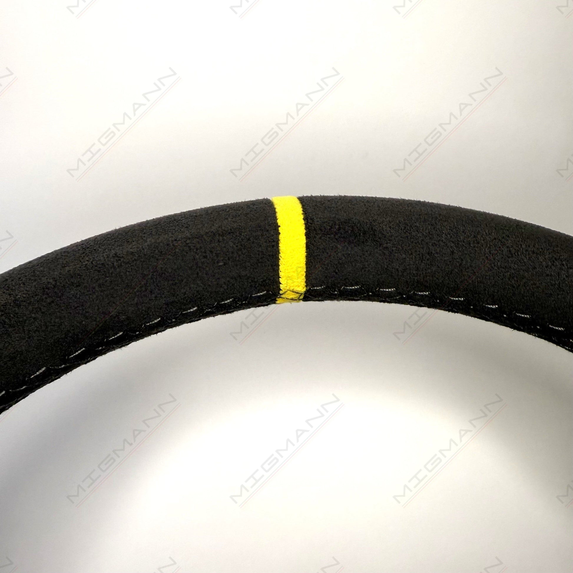 - Premium Alcantara grip with yellow center marker