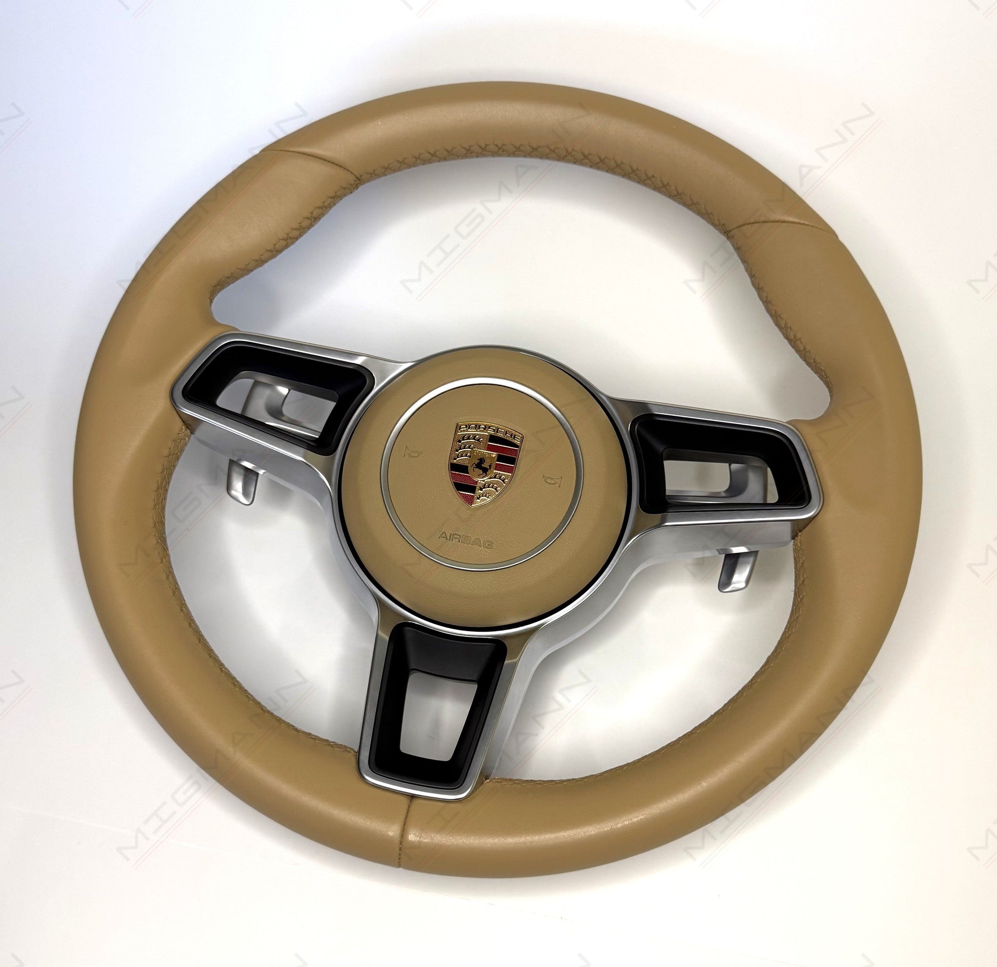 This OEM Porsche steering wheel is finished in elegant Luxor Beige leather and features integrated paddle shifters in a non-multifunctional layout – no buttons, no distractions. It comes complete with the original OEM Porsche airbag, making it a plug-and-play upgrade for automatic Porsche models.