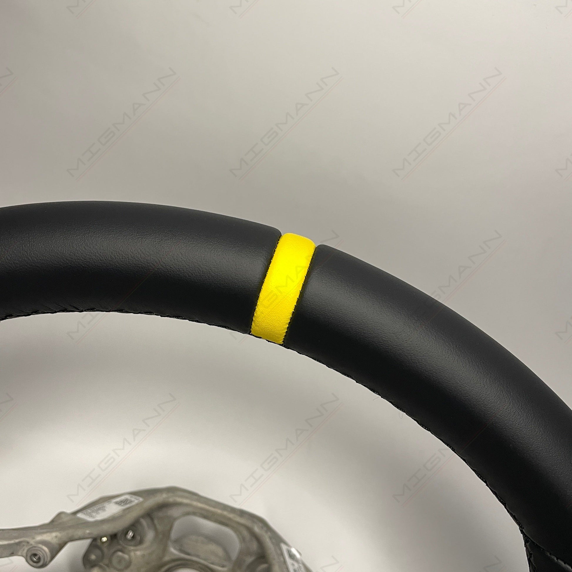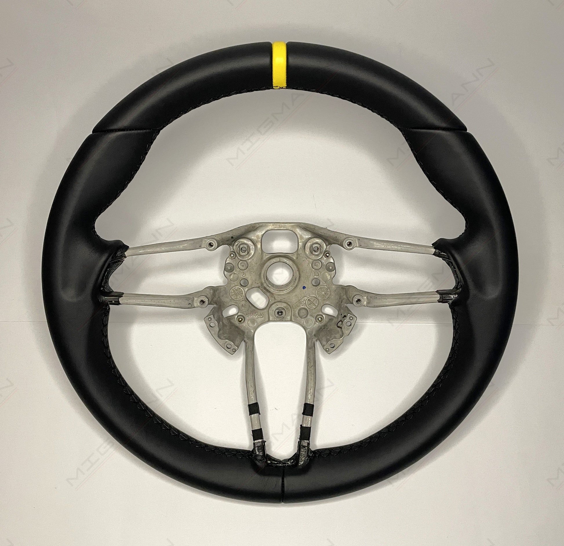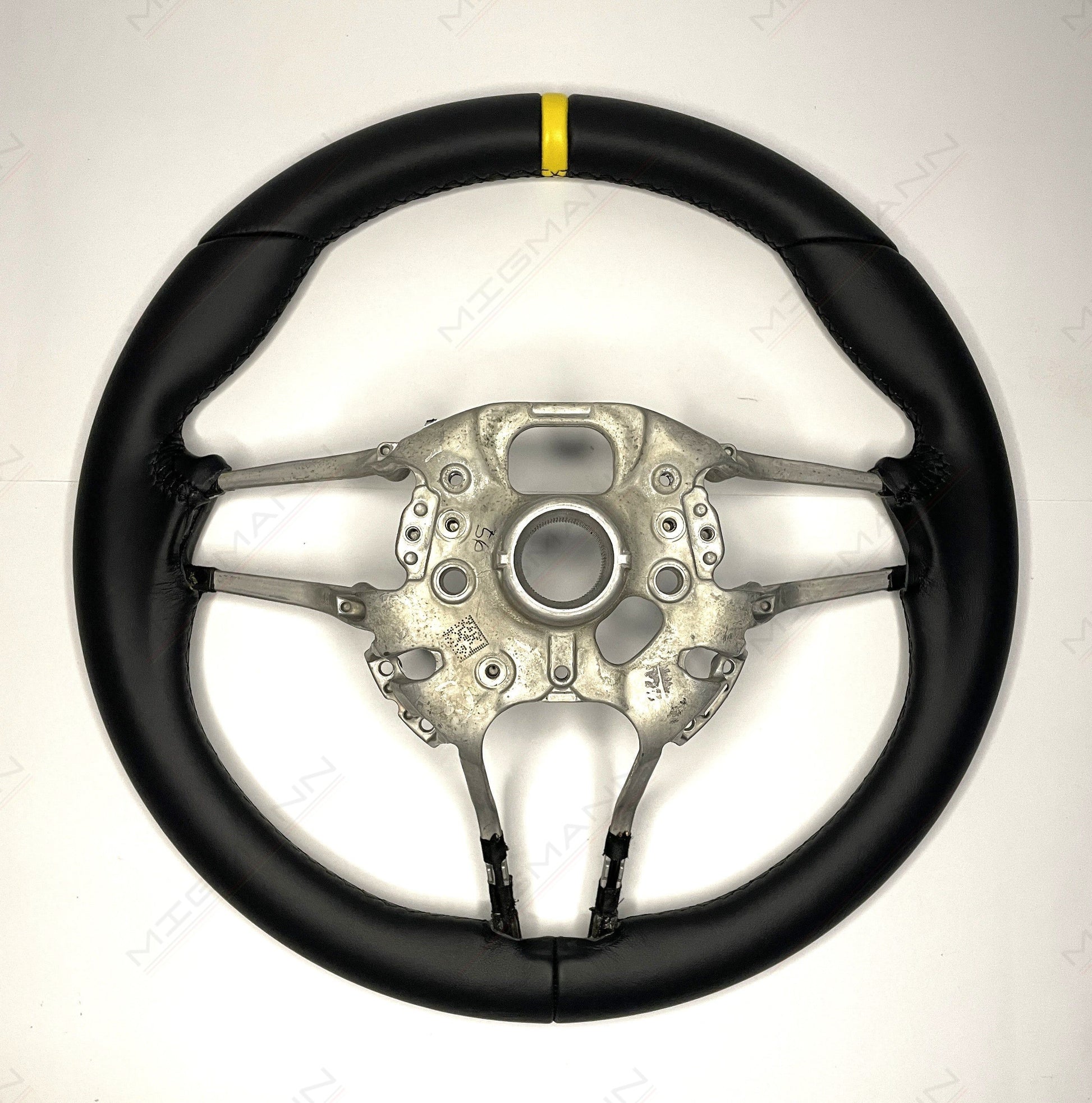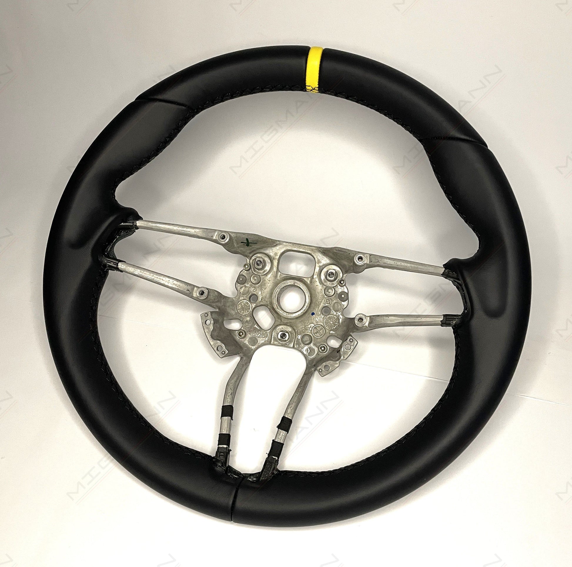 The Porsche steering wheel is newly refurbished leather with a yellow target marker.