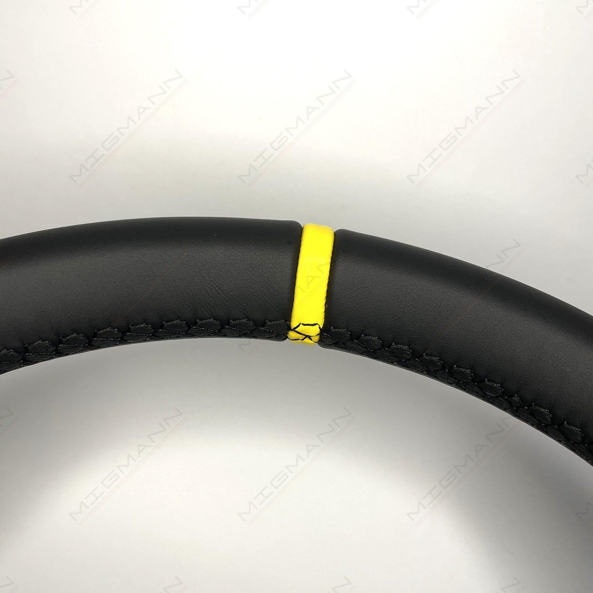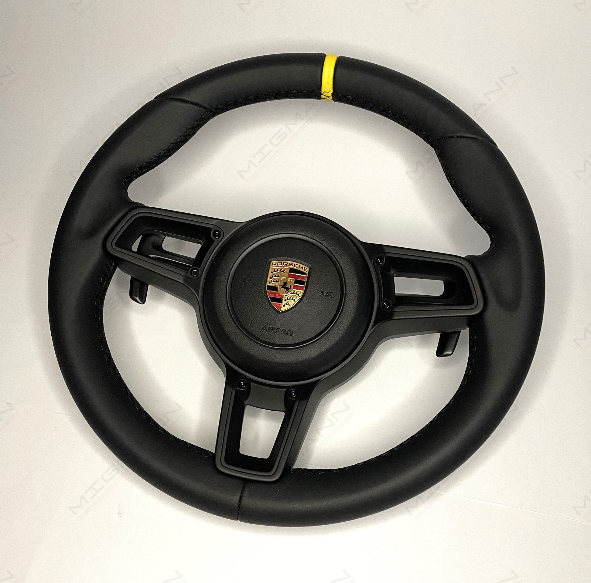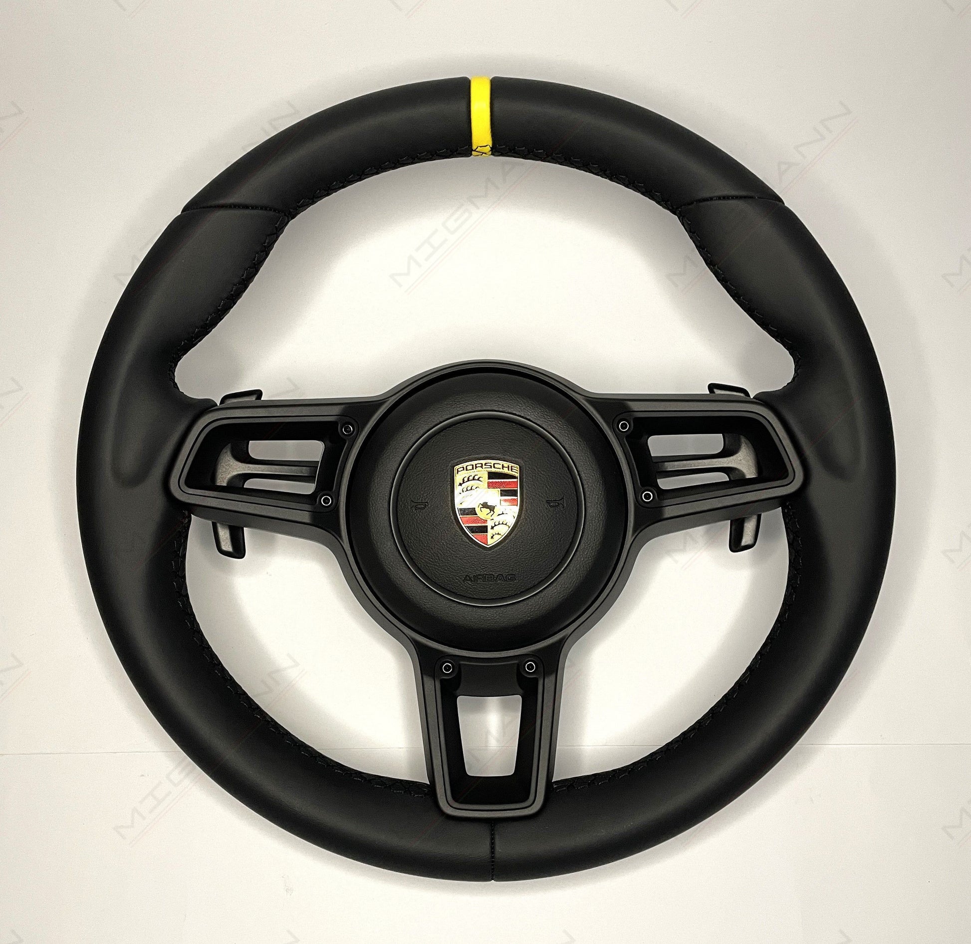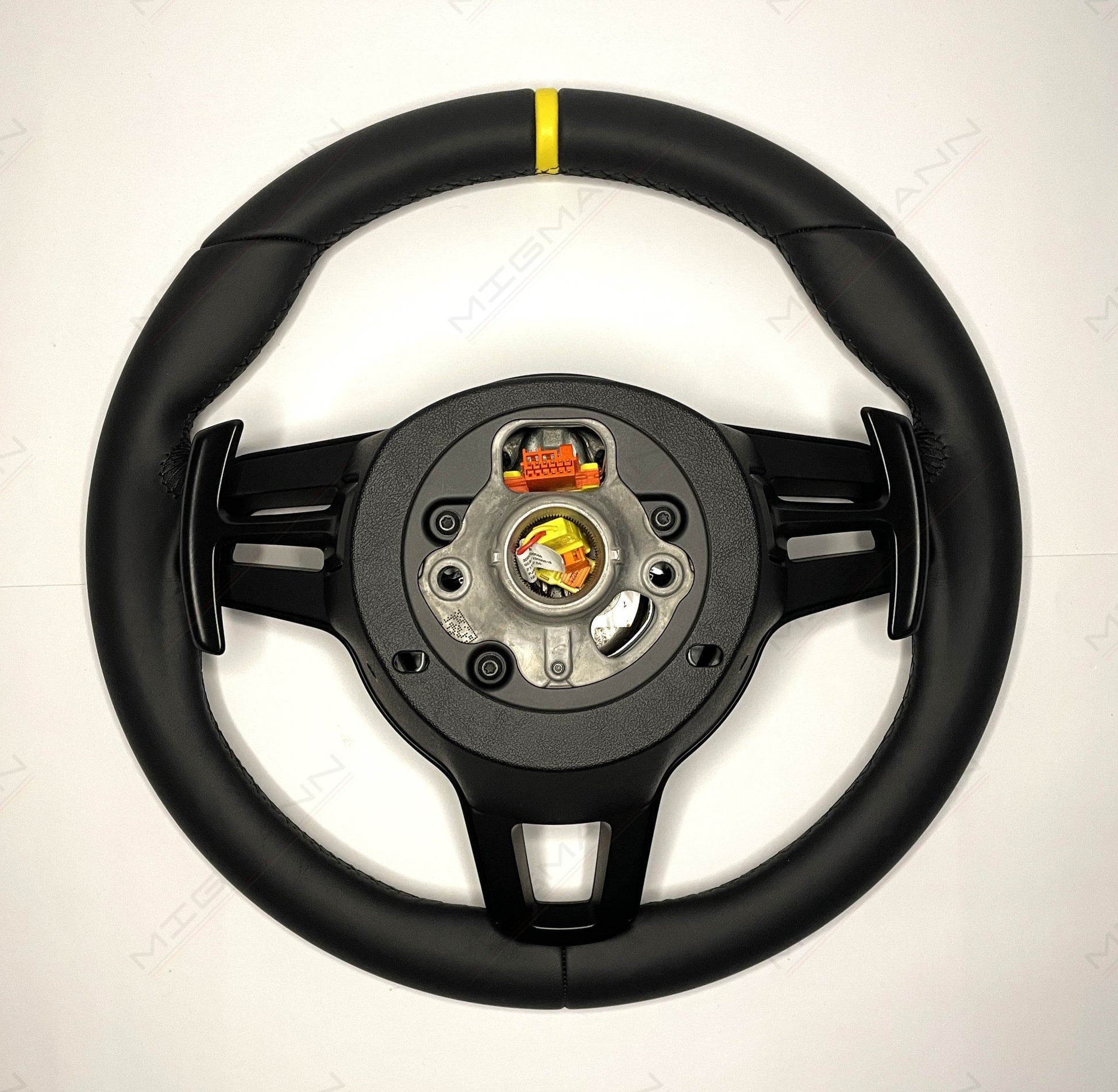 The Porsche 991.2 steering wheel with yellow center target and black stitching excellent condition.