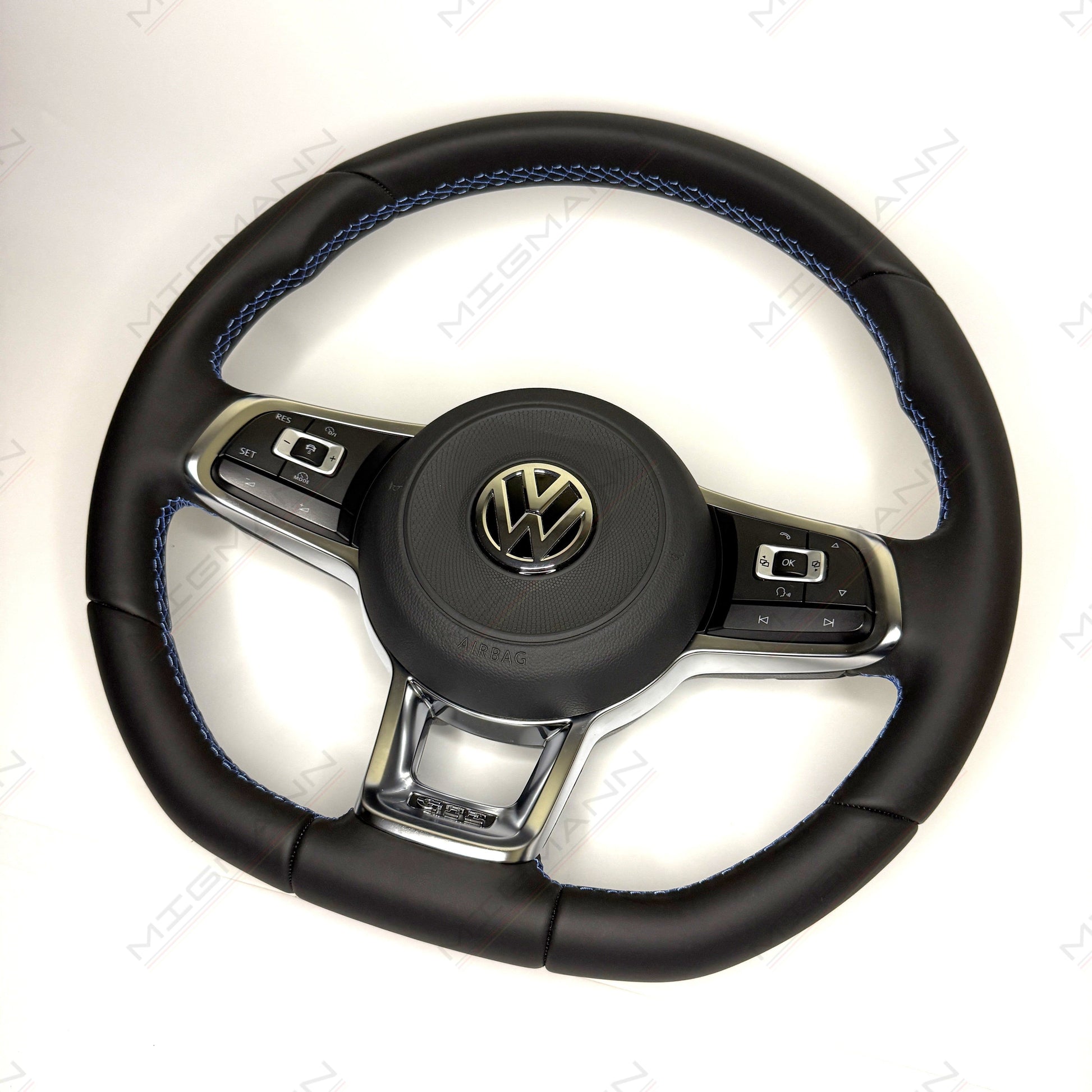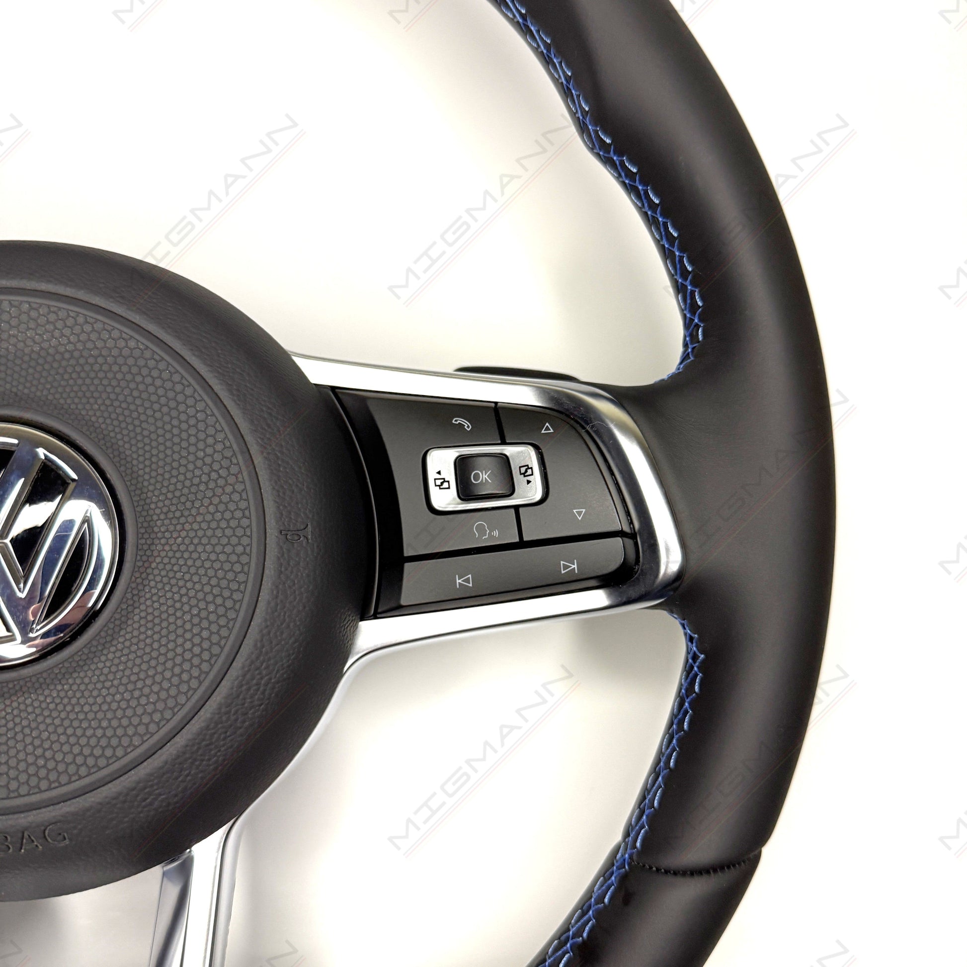 Volkswagen GTE steering wheel, offered in excellent condition. Finished in high-quality black leather with distinctive blue GTE stitching, it adds a sporty and premium feel to your cockpit. The steering wheel is equipped with multifunctional controls, paddle shifters for automatic transmission, and includes the original airbag, making it a complete ready-to-install solution.