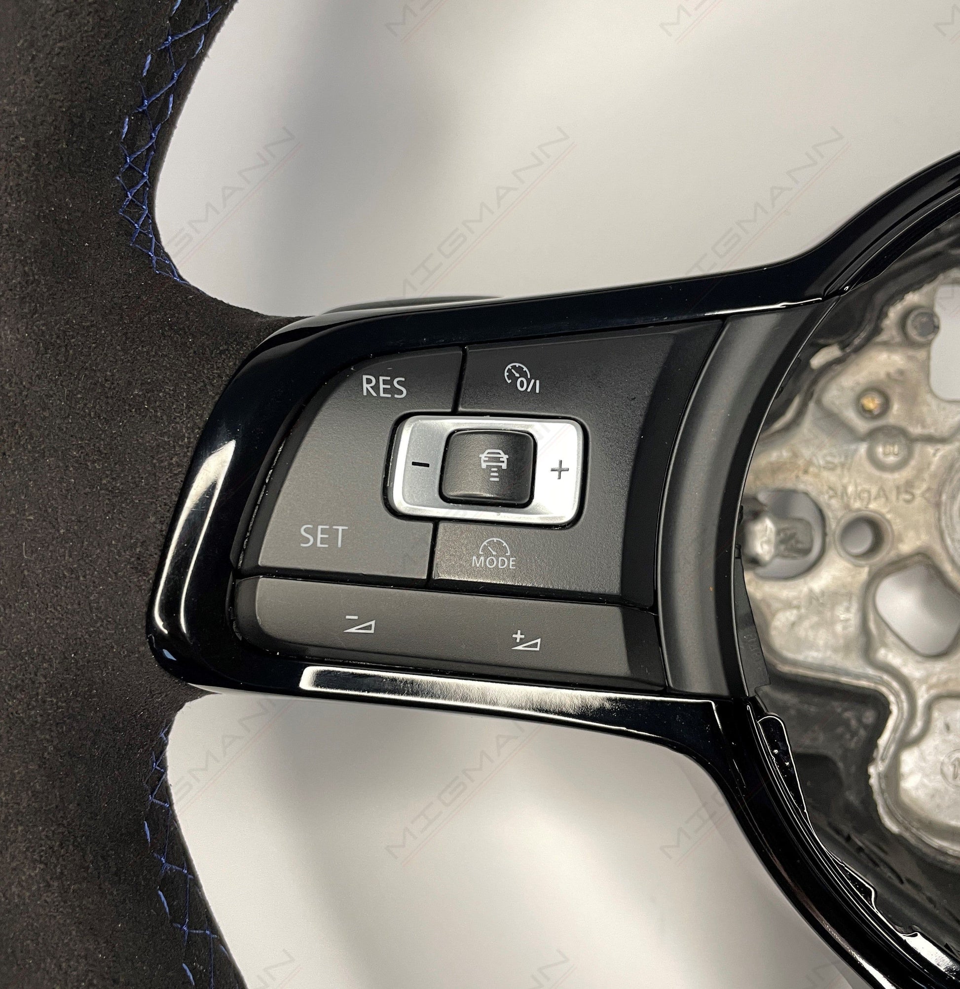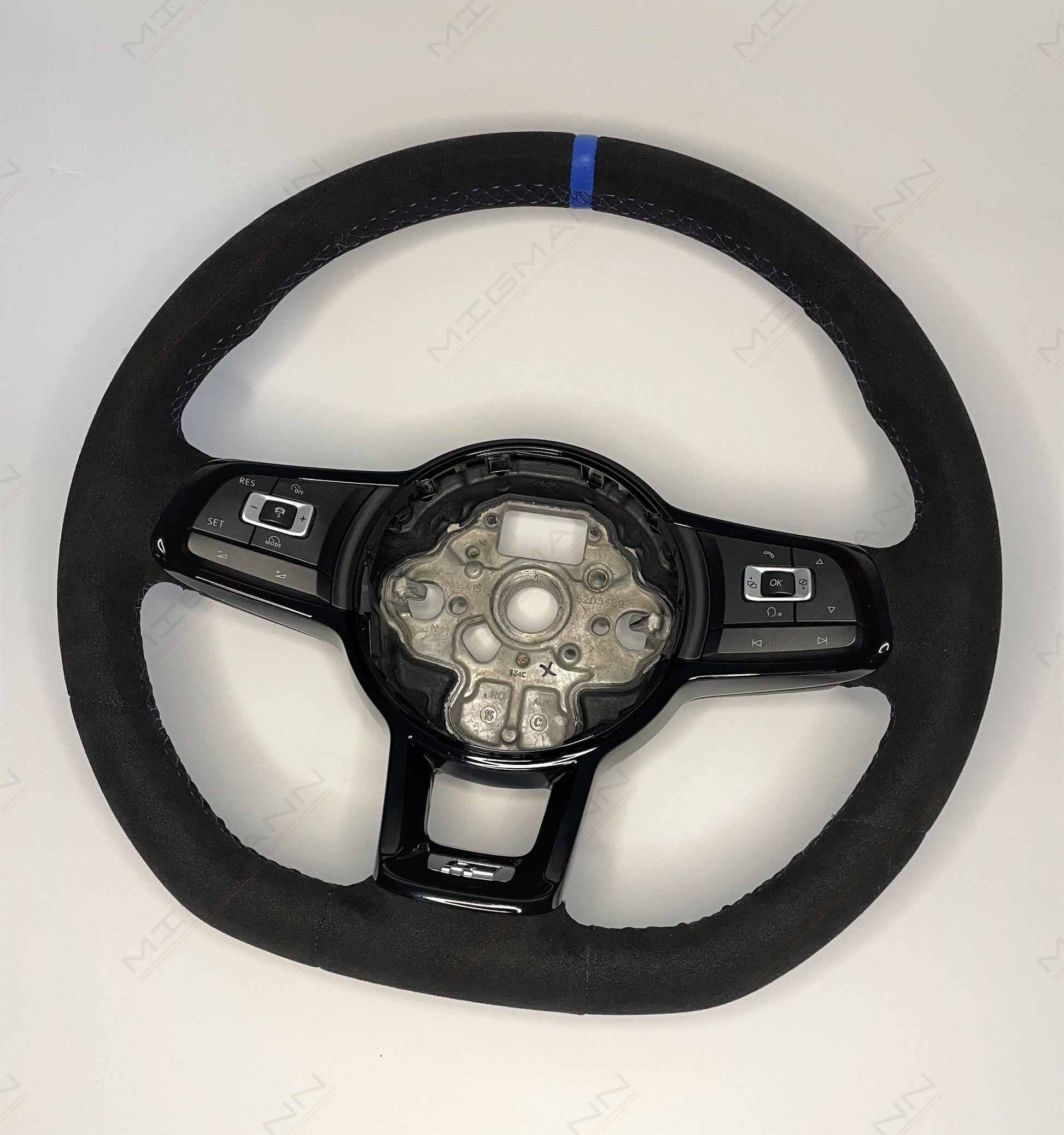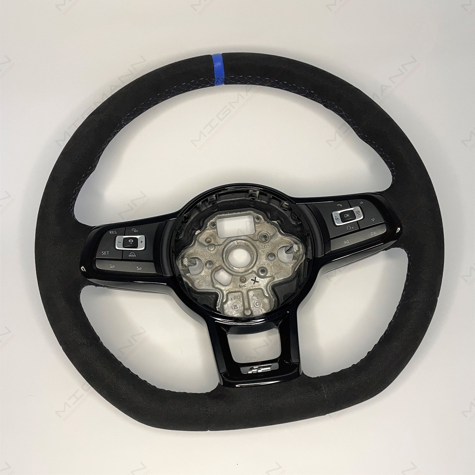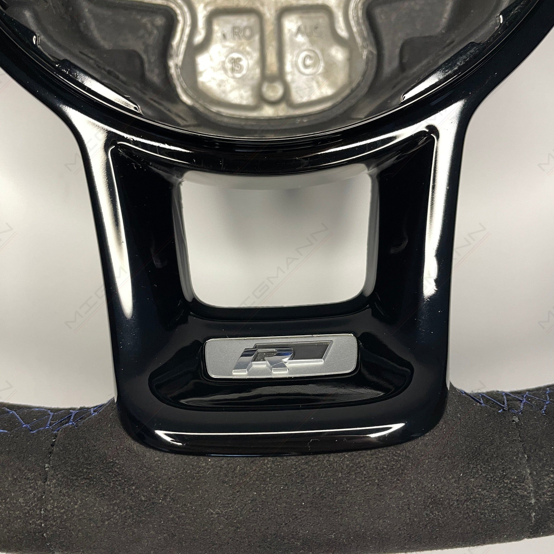 Volkswagen R-line Alcantara steering wheel with blue stitching and black trim.