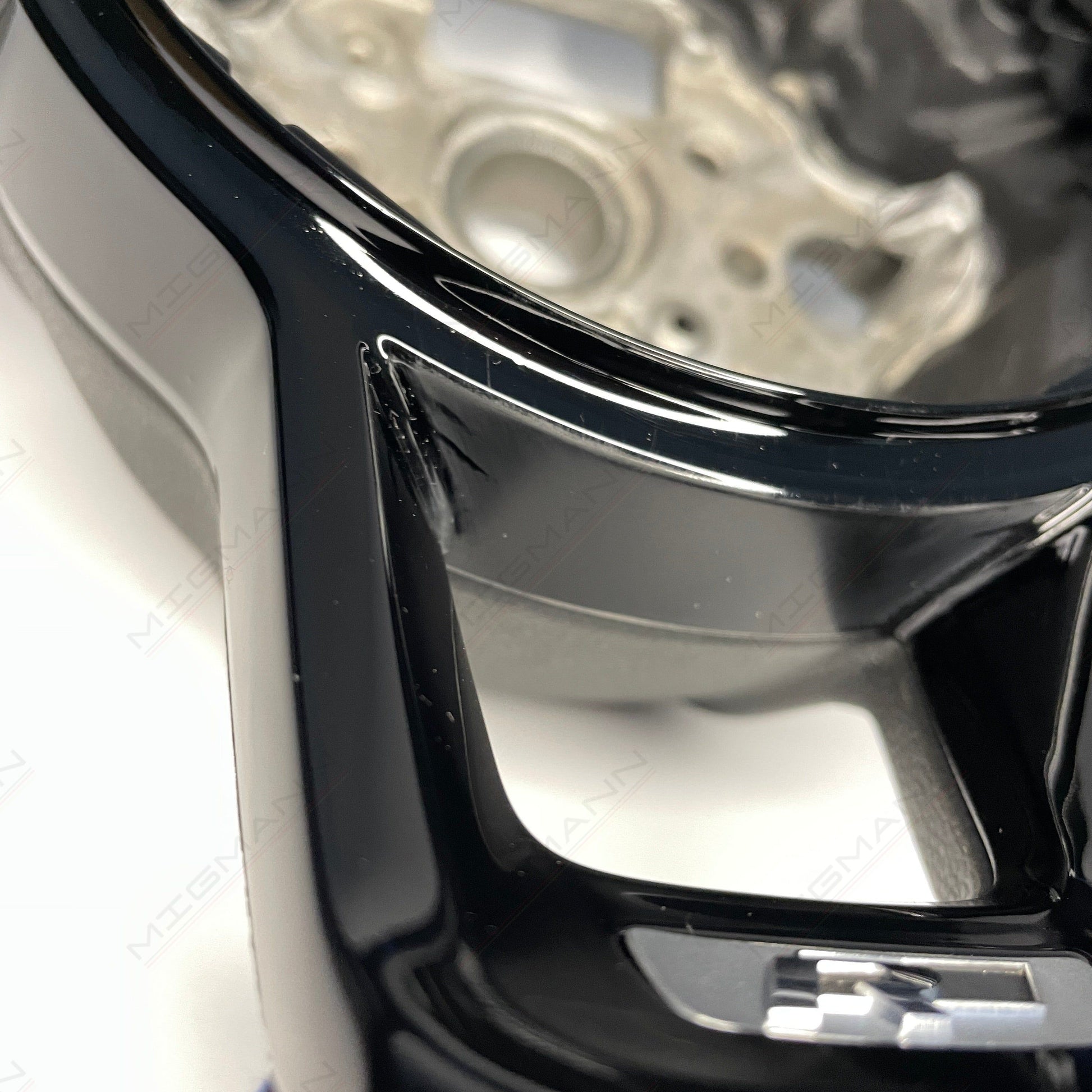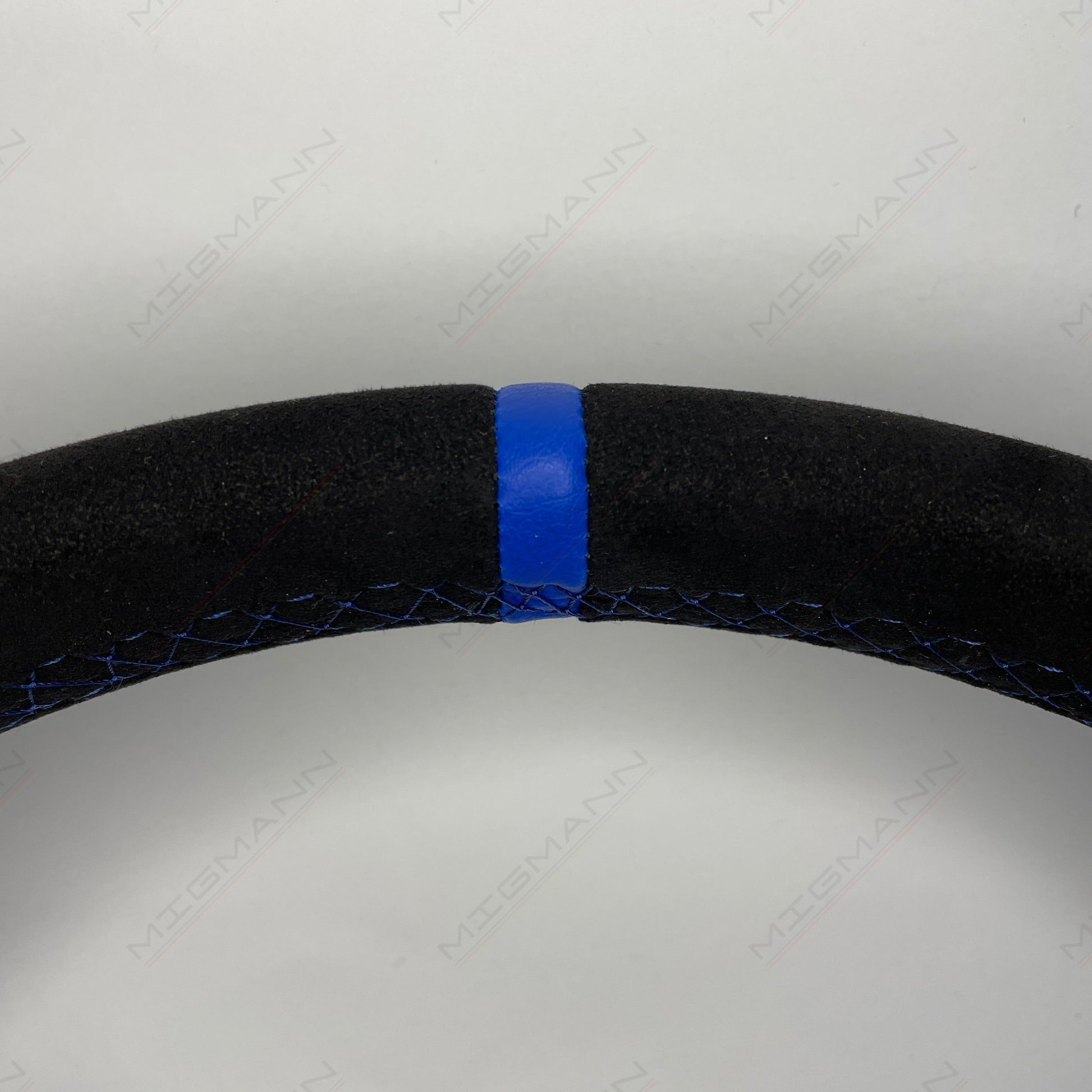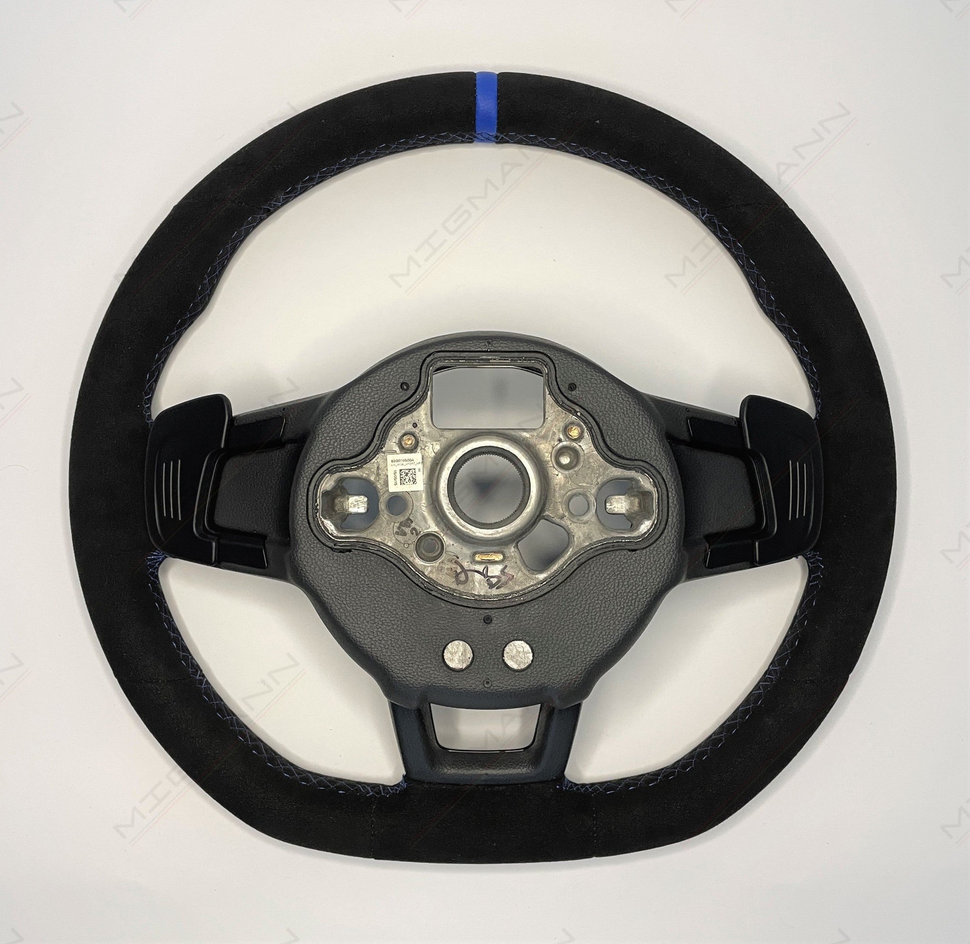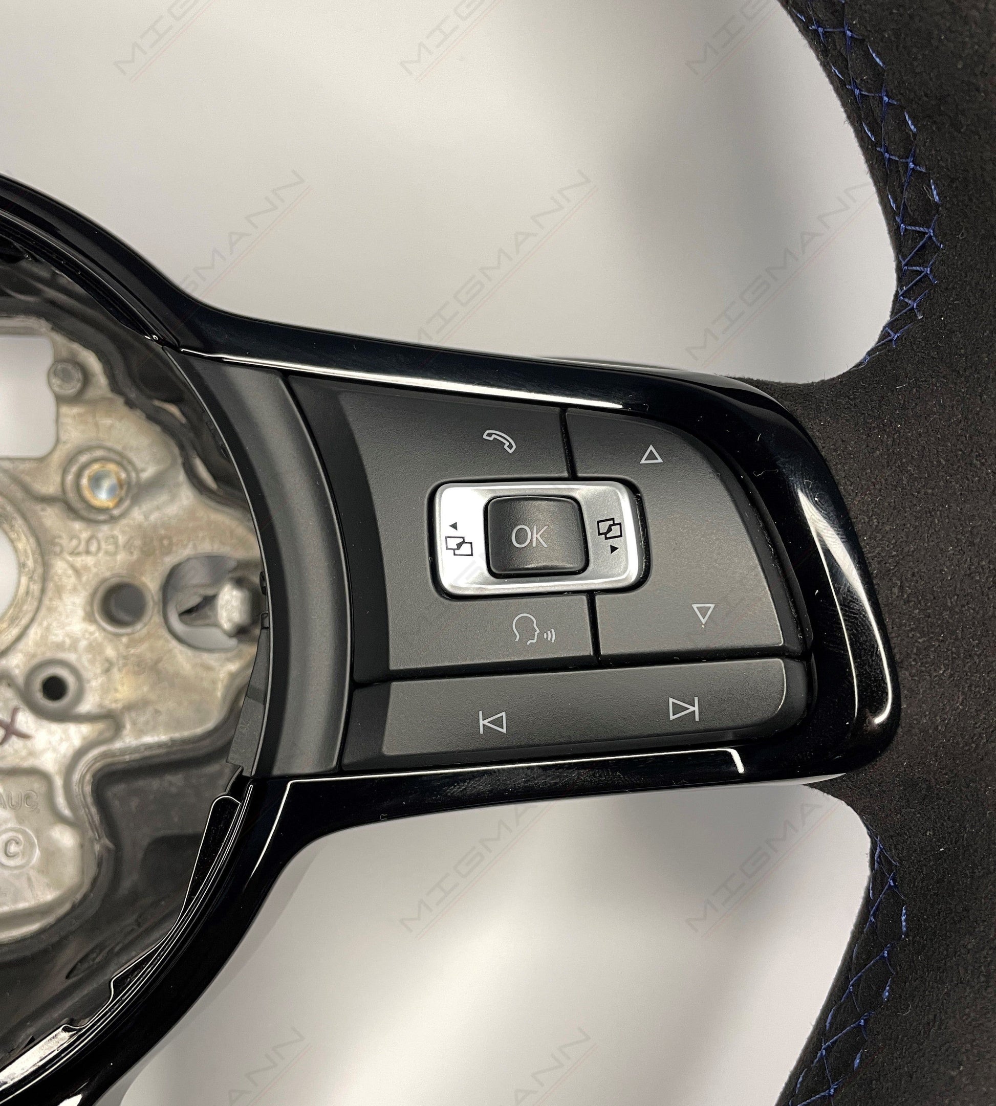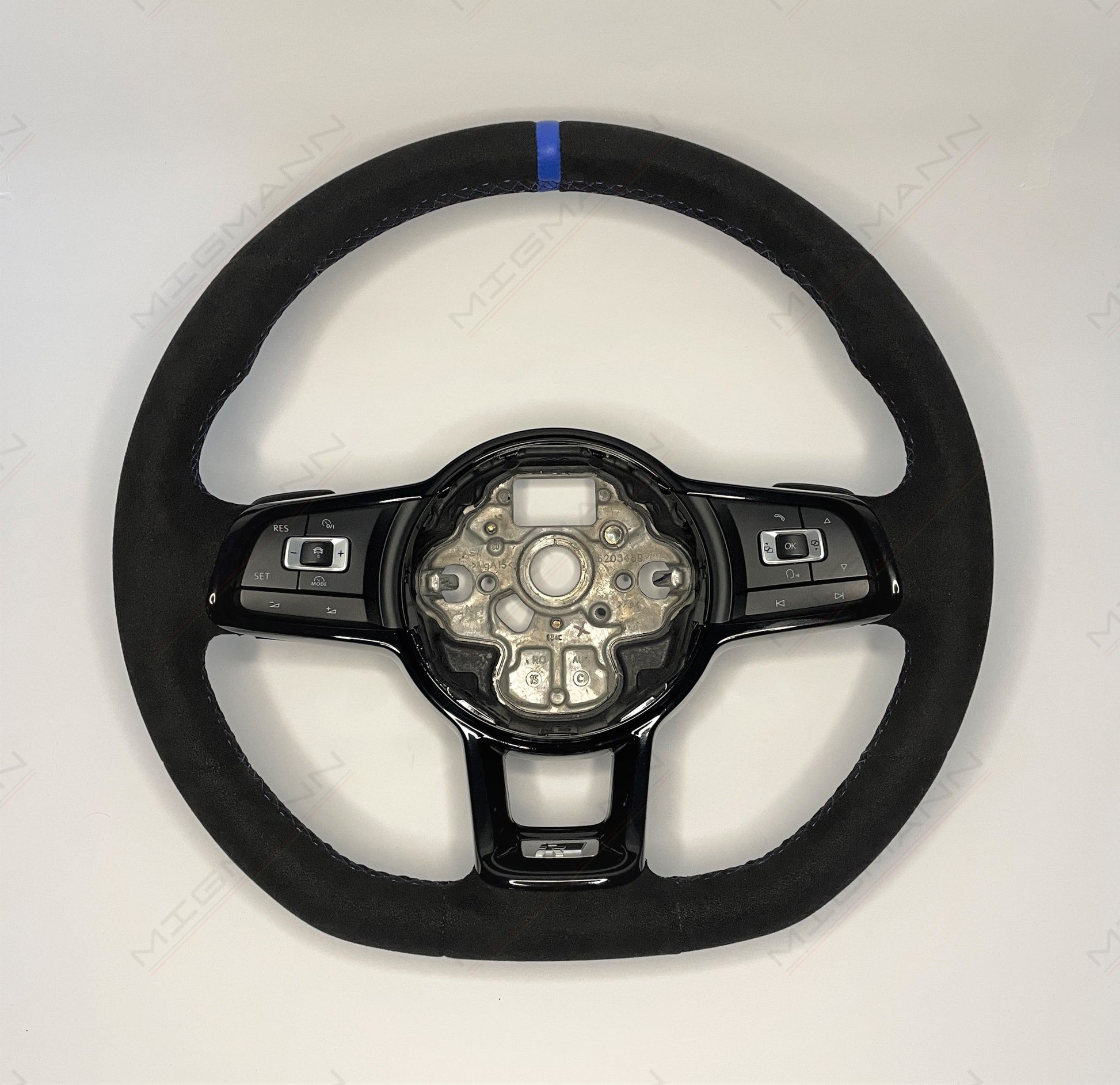 Volkswagen R-line Alcantara steering wheel with blue stitching and black trim.